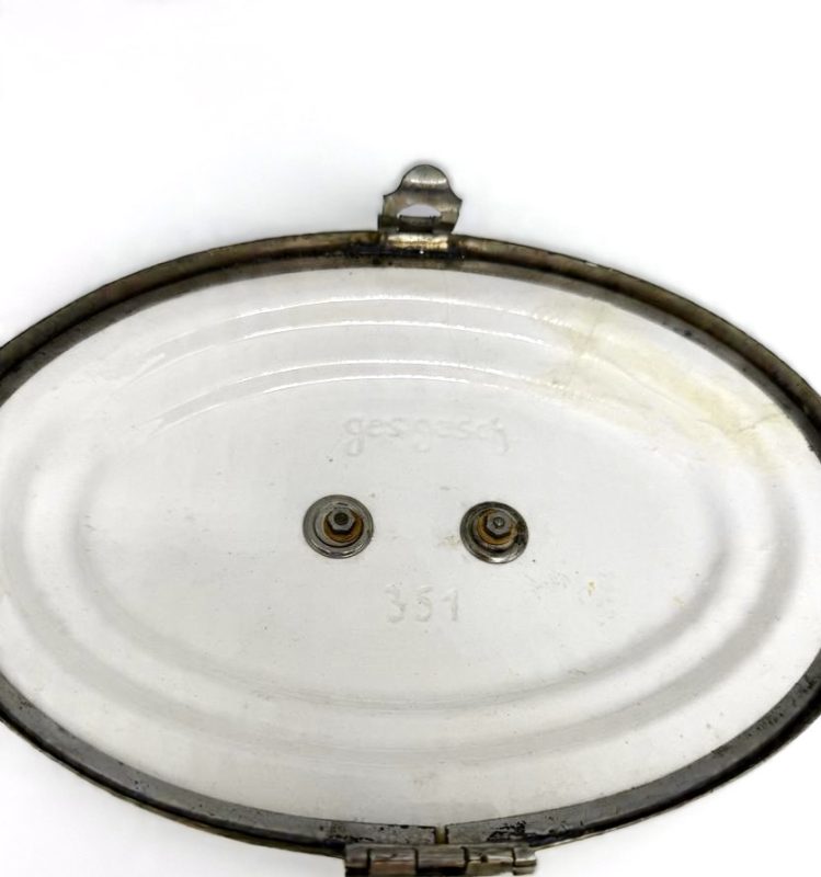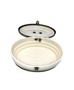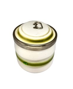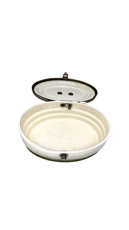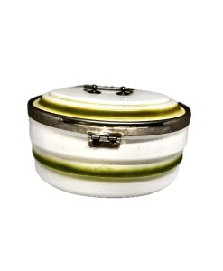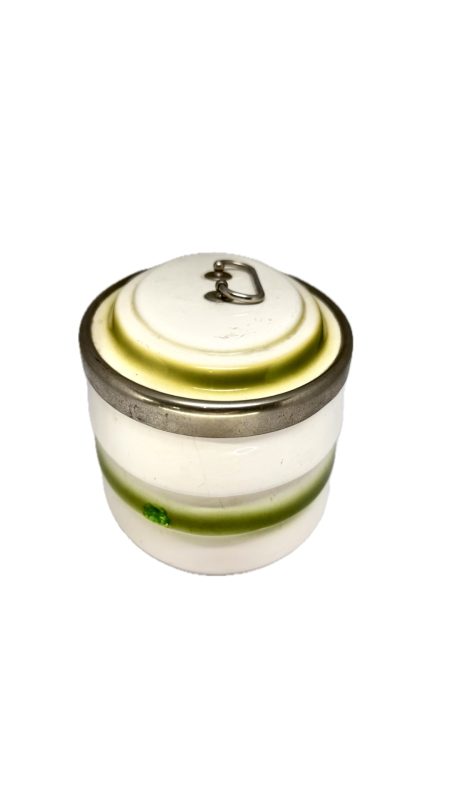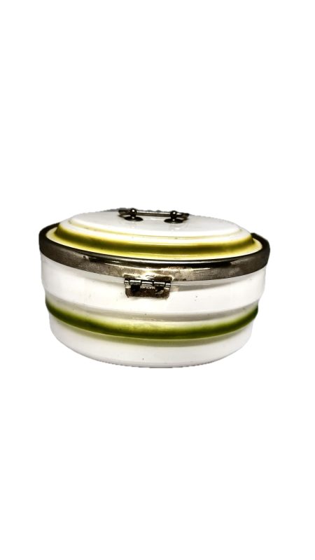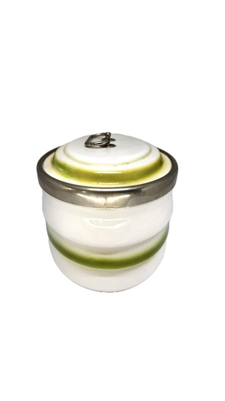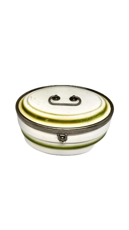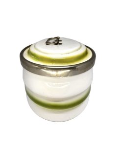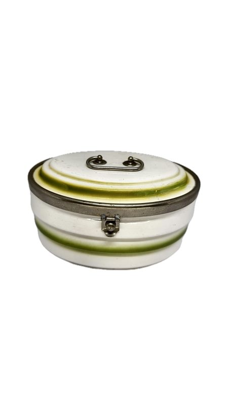 Antiga biscoiteira em porcelana branca com detalhe em verde, com alça e fecho em metal.