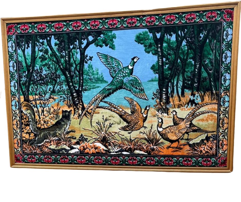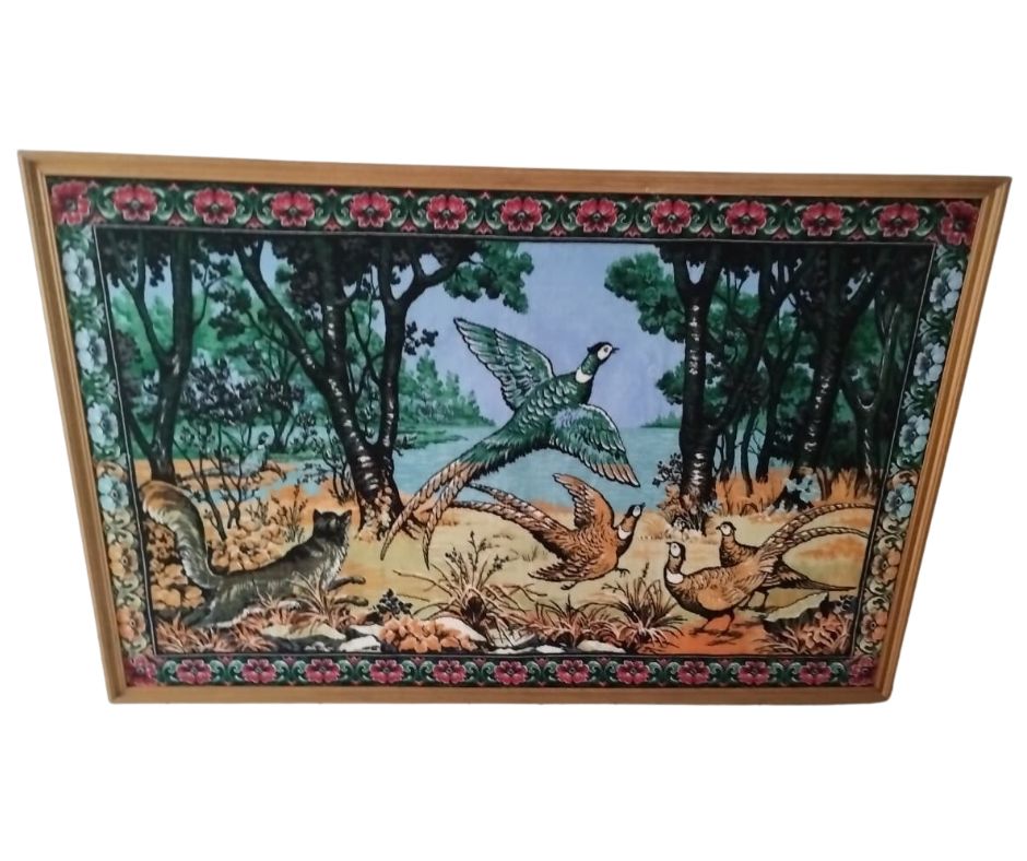 | Antiga tapeçaria emildurada em madeira com representação de fauna e flora. Med: 166 x 108 cm. |