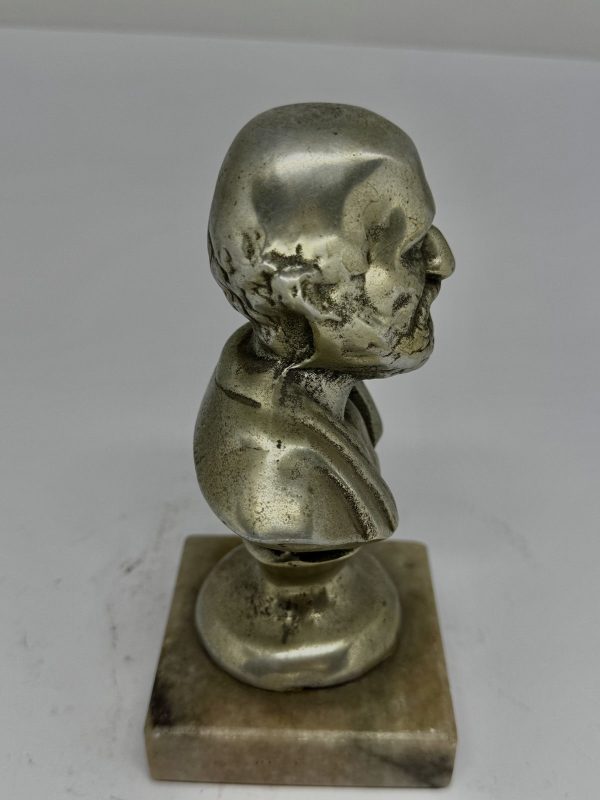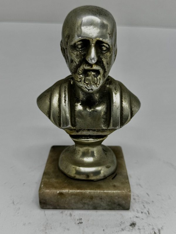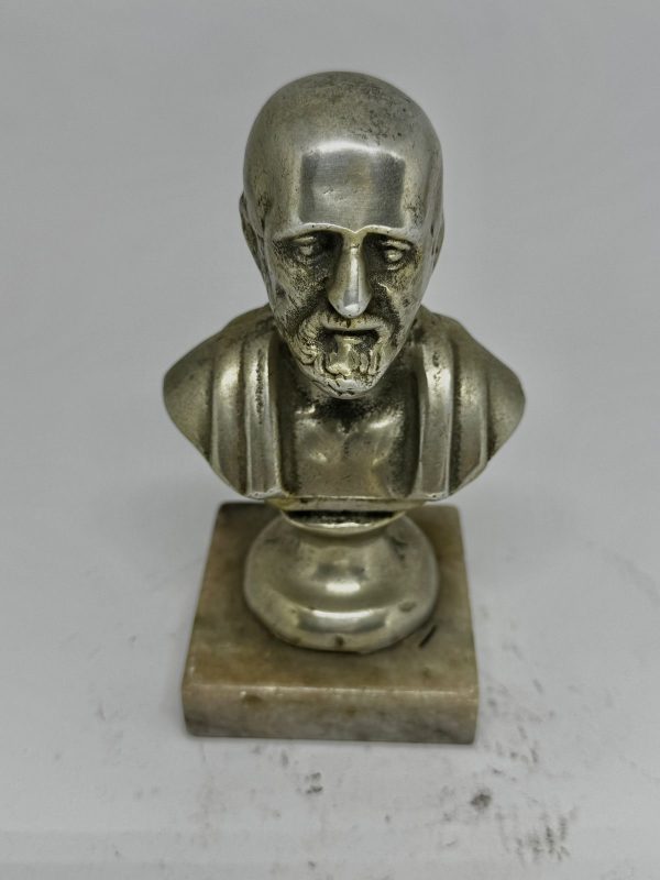 Antigo busto em metal prateado, sobre base em mármore, representando “Hipocrates”(o pai dá medicina).