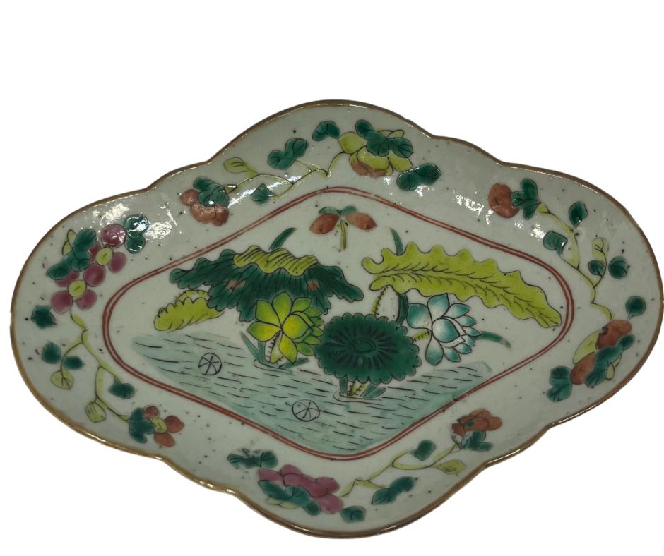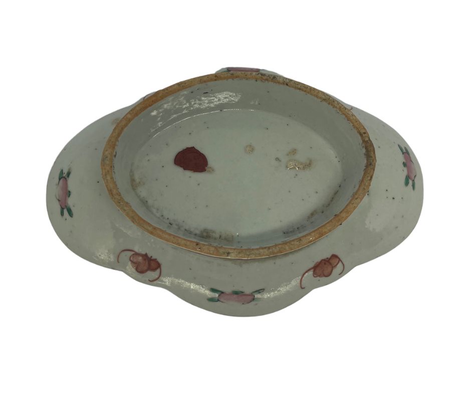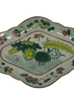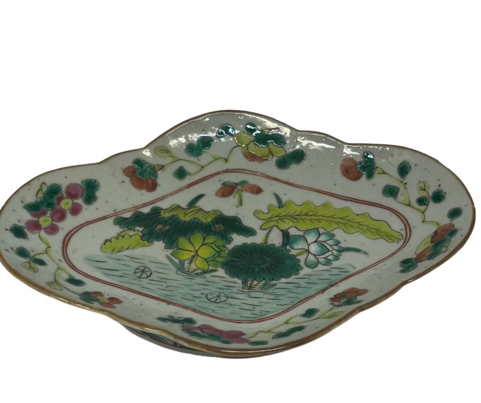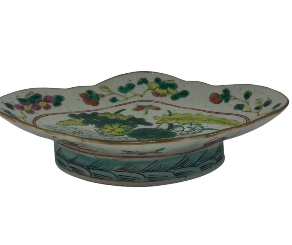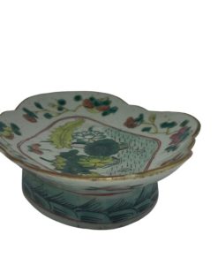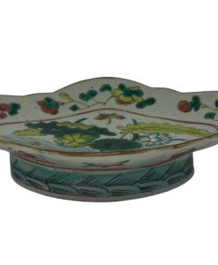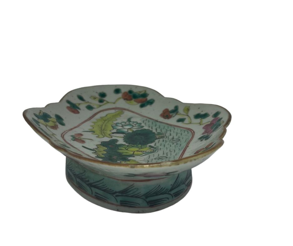 | Antigo covilhete em porcelana oriental policromada com temática floral. Med: A: 6 L: 22 P: 16 cm |