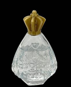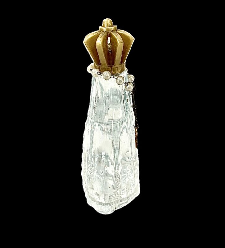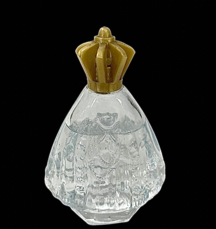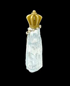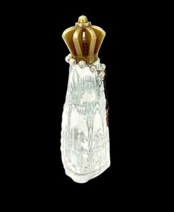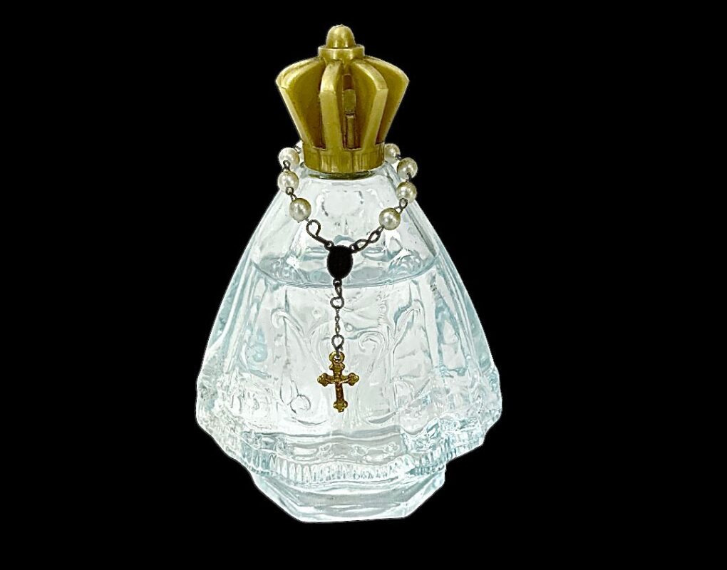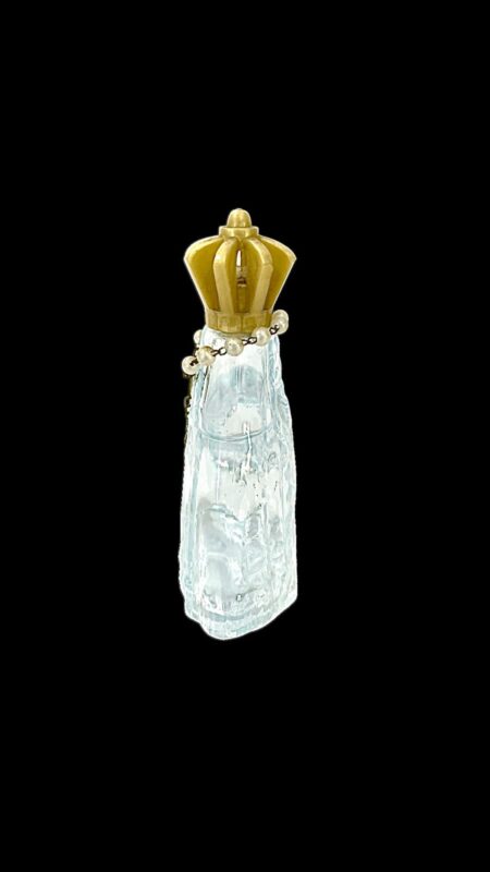 | Antigo perfumeiro em vidro artístico lapidado representando imagem de Nossa Senhora Aparecida com terço ao redor , contendo agua benta . Medidas: A: 13 cm. L: 10 cm. P: 05 cm.