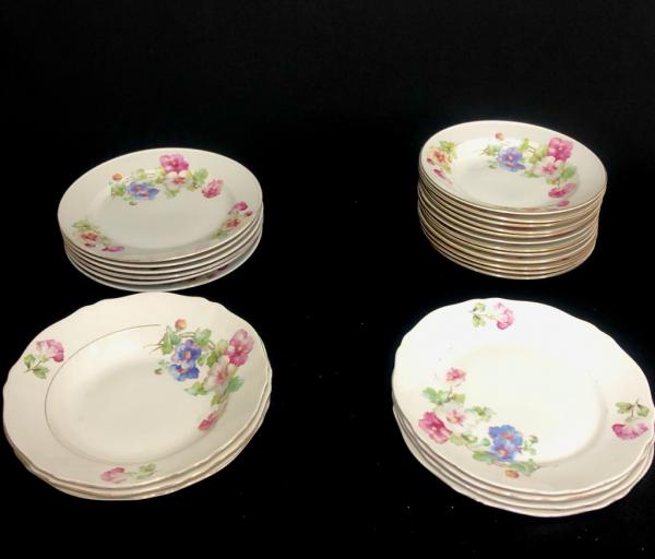 | Aparelho de jantar em porcelana decorado com temática floral e frisos dourados, composto por sopeira, quatro travessas redondas, dez pratos rasos, doze pratos fundos, 5 pratos para bolo e 6 pratos para sobremesa, totalizando 38 peças, Garantia: Temos mais de 25 anos de experiência e tradição no mercado de Arte brasileiro. Satisfação garantida ou seu dinheiro de volta ! Forma de Envio: À combinar (!) Observação Importante (!) : Salientamos o fato de trabalharmos no ramo de Arte e Antiguidades, o qual as peças estão sujeitas a apresentar variações de marcas do tempo que na medida do possível estão descritas no anúncio. |