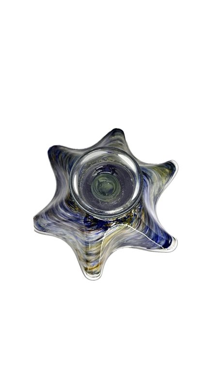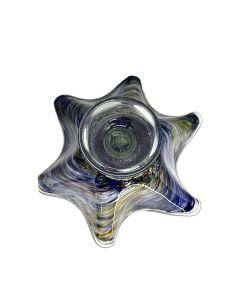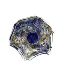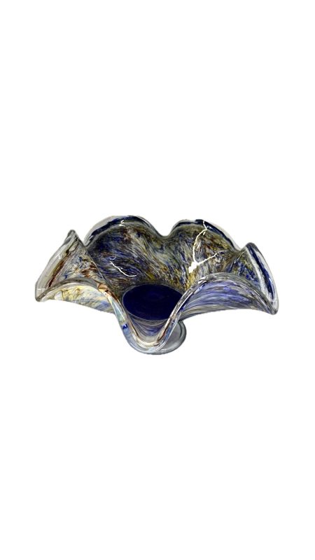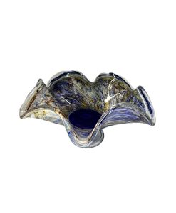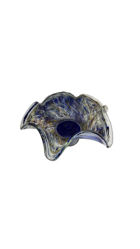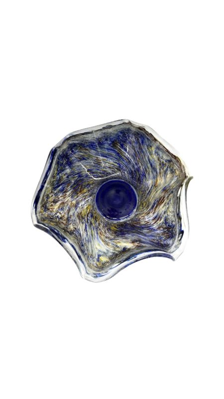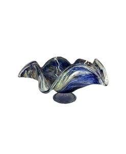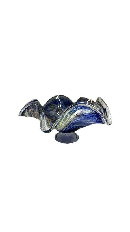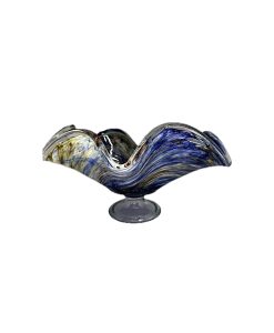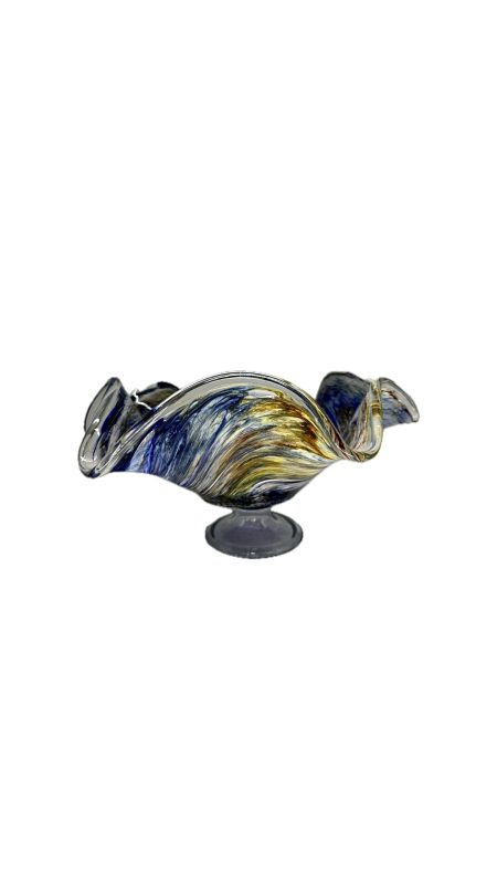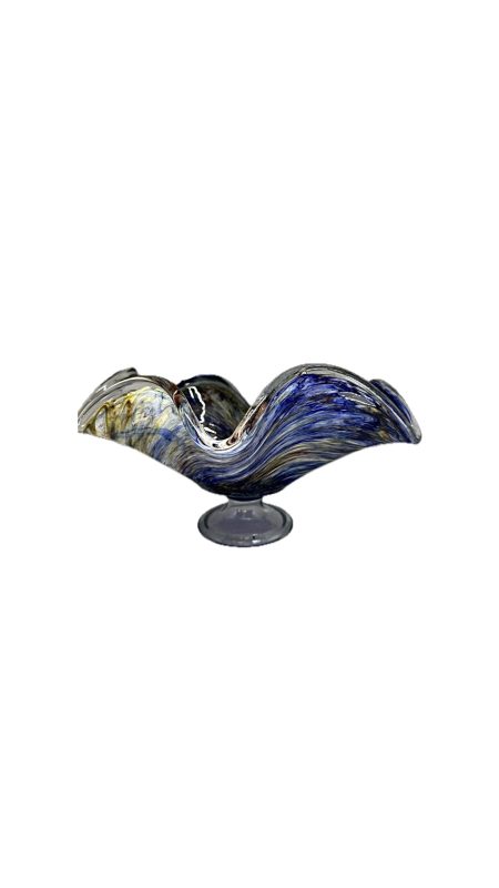 Belíssima fruteira em vidro artístico com rica policromia, com nuances em azul e amarelo.