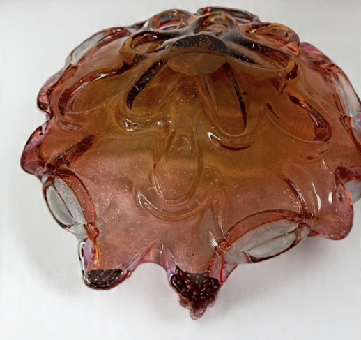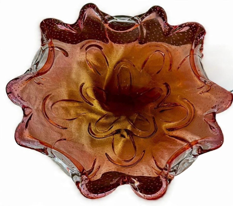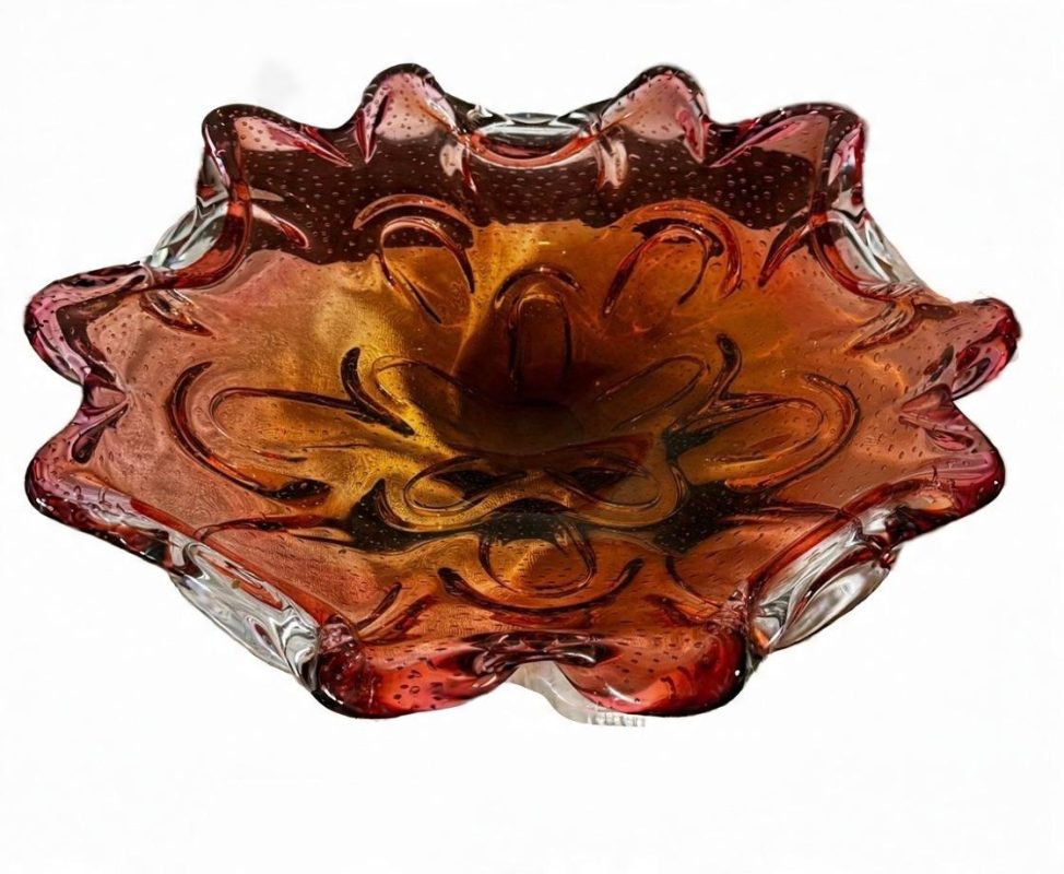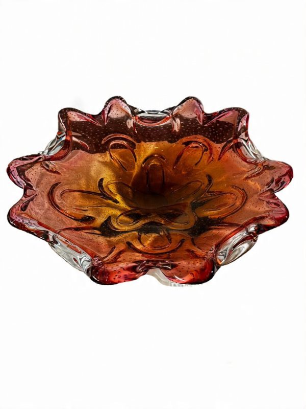 Grande Centro de Mesa em vidro de Murano na tonalidade vermelha com detalhes em bolhas. Medidas: