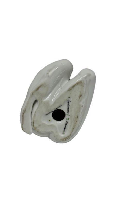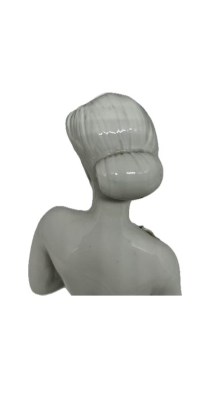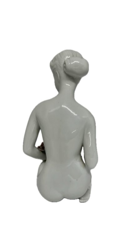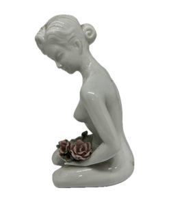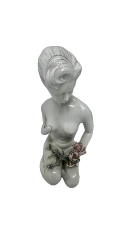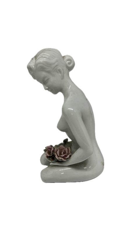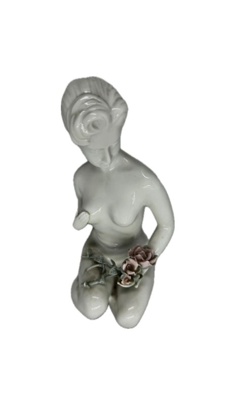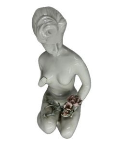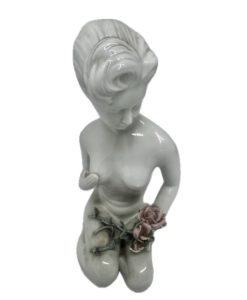 Escultura representando nu feminino, com ramo de flores em relevo, em porcelana, manufatura Santíssimo porcelana.