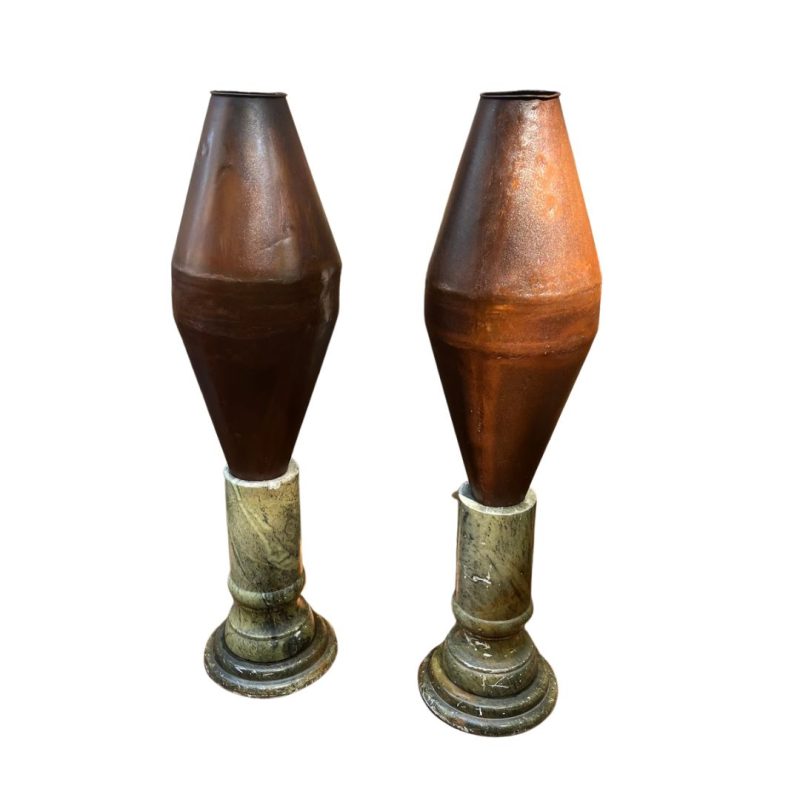 | Curioso par de Vasos em ferro em formato losangular. Med: A: 72 D: 32 cm. |